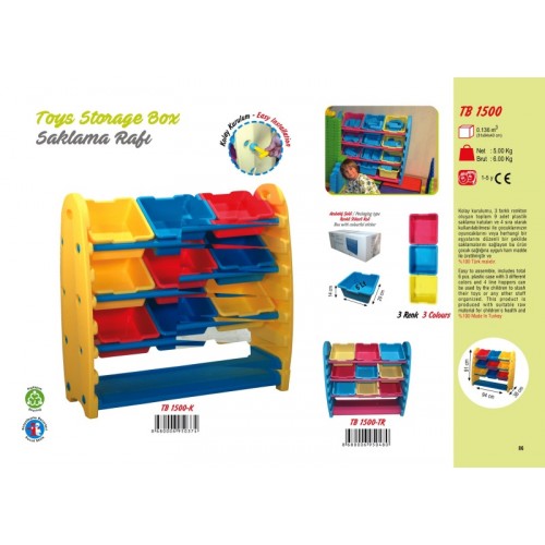Kolay kurulumu, 3 farklı renkten oluşan toplam 9 adet plastik saklama kutuları ve 4 sıra olarak kullanılabilmesi ile çocuklarınızın oyuncaklarını veya herhangi bir eşyasını düzenli bir şekilde saklamasını sağlayan bu ürün çocuk sağlığına uygun ham madde ile üretilir ve %100 TÜRK MALIDIR....