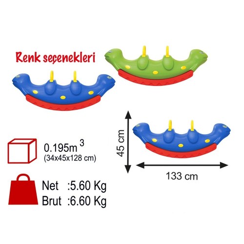 Yüksek yoğunluklu polietilen (HDPE)’den üretilmiştir. Rahatlıkla taşınbilir. Dayanıklılığı ve dengesi çocuğunuzun güvenle sallanabilmesi için özenle tasarlanmıştır. 2 veya 3 çocuk sallanabilir. Çocukların okul öncesi motor becerilerini geliştirir. Duyu bütünleme sürecini destekler.